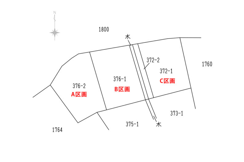 | 私道負担 | 無 | 接面方位 | 北側 接道 A区画 25.61m B区画 19.08m C区画 20.16m |
